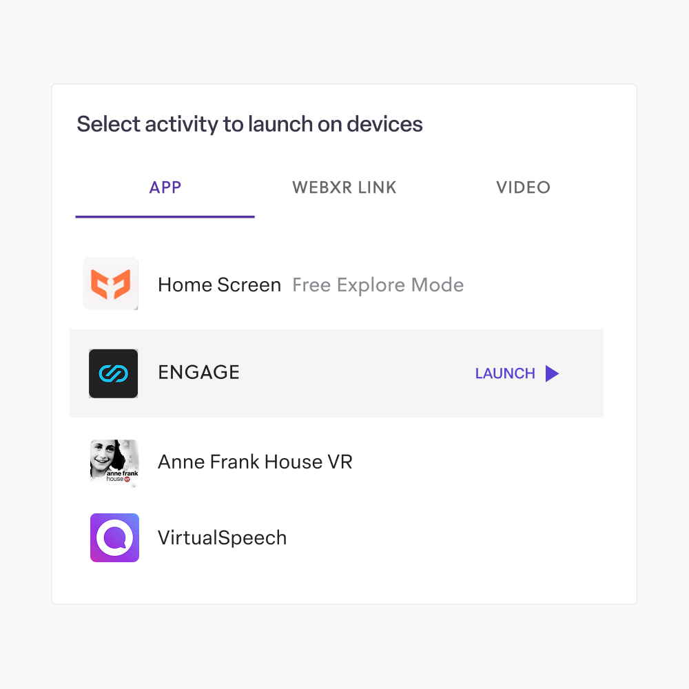 Launch any app, WebXR link, or video across every headset in a Room with a single click. Instantly place participants into the right VR experience, so your session stays organised and on track.